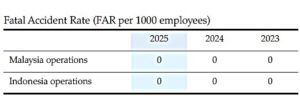 During 2025, we are pleased to inform that there was no occupational related fatal accident within our Malaysian operations.
