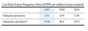 he difference of LTIFR between our Malaysian and Indonesian operations is due to 7.5 working hours per day for Malaysia while 7 working hours per day in Indonesia. In addition to that, the OSHA of Indonesia stipulates that any accidents regardless the manday lost shall be reported to JAMSOSTEK whereas OSHA of Malaysia stipulates that any accidents above 4 mandays lost shall be reported to DOSH/JKKP and SOCSO.
