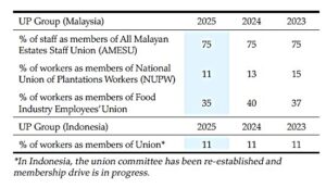 The Malaysian Plantation sector remains reliant on Guest Workers, who provide about 80-85% of the industry’s labour requirement today. This is not at the expense of taking jobs away from local Malaysians as they prefer to work in urban cities and are just not interested in being employed as harvesters or to work with other field activities. In UP, as of 31 December 2025, we have 4,345 Guest Workers – mainly from Bangladesh, India and Indonesia – whom we consider as guests, and they are vital partners in our business along with our local workers. In some of these countries, there are risks of systemic human rights abuses, which is an important topic that has escalated since 2021 through numerous reports and media articles, particularly on the corrupt practices of undisclosed middlemen as part of the Guest Workers’ recruitment process. In light of this, it has become evident that more needs to be done to safeguard migrant workers during their recruitment to prevent such middlemen from abusing their inherent vulnerability through deception, thereby driving them into debt bondage. In combination with today’s improved understanding of forced labour risks and indicators, we agree to the growing consensus that more needs to be done to safeguard Guest Workers during their recruitment, from potentially becoming victims of deception, abuse of vulnerability and debt bondage.