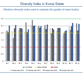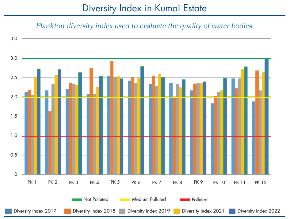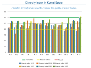 This means that the water is slightly polluted but showing signs of improving. The rehabilitation of riparian forest along the streams in PT SSS is showing positive trend, not least by minimizing organic and inorganic pollution washout in all three estates. What remains in the rehabilitation process is to restore the aquatic food web where increasing numbers of plankton also leads to growing diversity and populations of other aquatic life forms, especially vertebrates (e.g., fish, amphibians) and invertebrates (e.g., mosquito larvae, aquatic beetles, benthic).