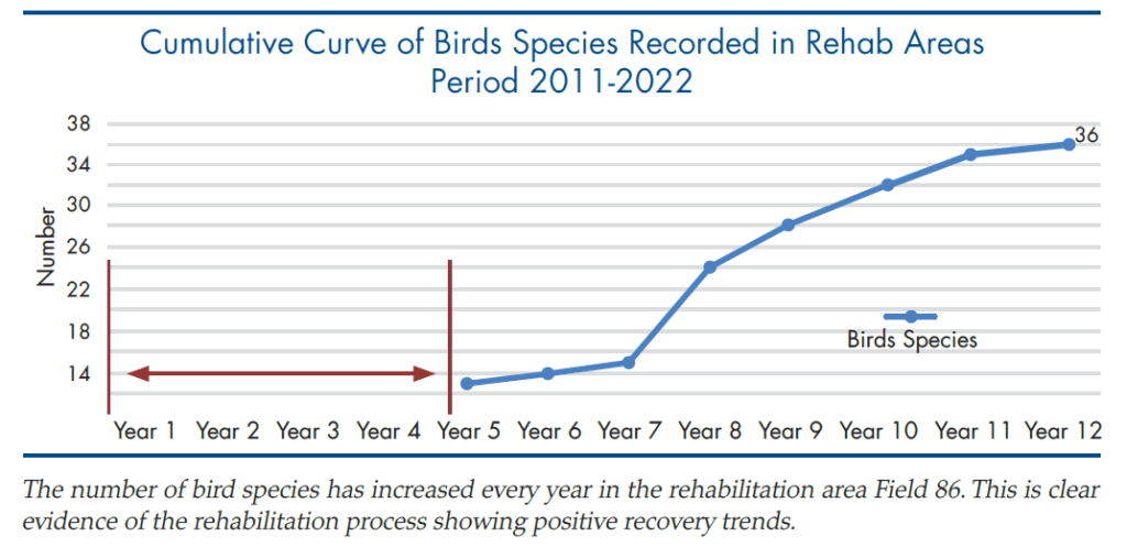 The bird monitoring began 4 years into the rehabilitation process, when the first planting activities were initiated. Subsequent monitoring reveals an increasing number of bird species throughout the years. From merely 13 species in 2015, the BioD Team recorded 42 bird species in 2025. This is another testament to a successful rehabilitation process. It is expected that bird diversity will continue to increase in tune with the increasing canopy height and natural immigration of a variety of plants to Field 86. The next big milestone is when rare and endangered birds begin to return to the area in the future
