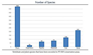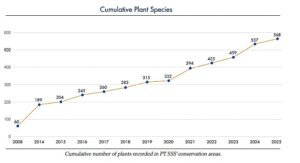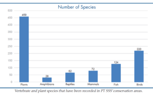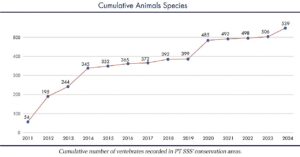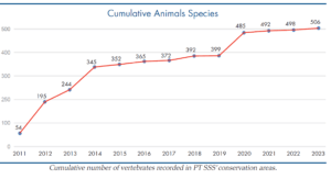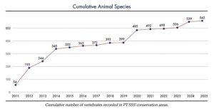 In 2024, the team added 33 new species to PT SSS’ species list, consisting of 3 reptiles, 14 fish, 15 birds and 1 mammal. To date, the BioD has recorded a total of 539 different vertebrate species of which 73 are mammals, 235 birds, 65 reptiles, 28 amphibians and 138 fish. In addition, 537 plants species have been recorded in PT SSS’ conservation areas. The total number of species is expected to increase significantly in the future when more surveys are completed, and rehabilitation areas mature.