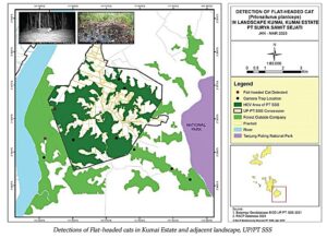 During the most recent survey period from January-March 2025, the Flat-headed cat was recorded twice near water sources and mangrove areas. These findings underscore the significance of riparian and mangrove habitats in supporting the species and highlight the conservation value of the Kumai Conservation Area and surrounding forest patches managed by PT SSS. Our data confirms the continued presence of the Flat-headed cat within a landscape managed by an oil palm company, demonstrating that, with appropriate habitat protection, endangered species like the Flat-headed cat can persist within a production environment. The Kumai Estate and its conservation areas serve as important refuges for this elusive and endangered felid.