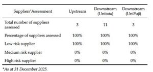 In 2025, we have gone beyond the self-assessment to conduct Suppliers’ Engagement Programme by assessing the on-site compliance level of our suppliers on the Key Performance Indicators (KPIs) as stipulated in our Responsible Sourcing Policy and Supplier’s Code of Conduct. Our time-bound commitments for all suppliers to achieve full compliance with our sourcing requirements/KPIs including our Upstream operations (third-party FFB suppliers) is 2027. The current position of our suppliers’ adherence to our sourcing requirements/KPIs is ranged between 85-95%, hence they are categorised as low risk suppliers. Our milestones is to achieve 100% compliance with our sourcing requirements/KPIs by 2027.